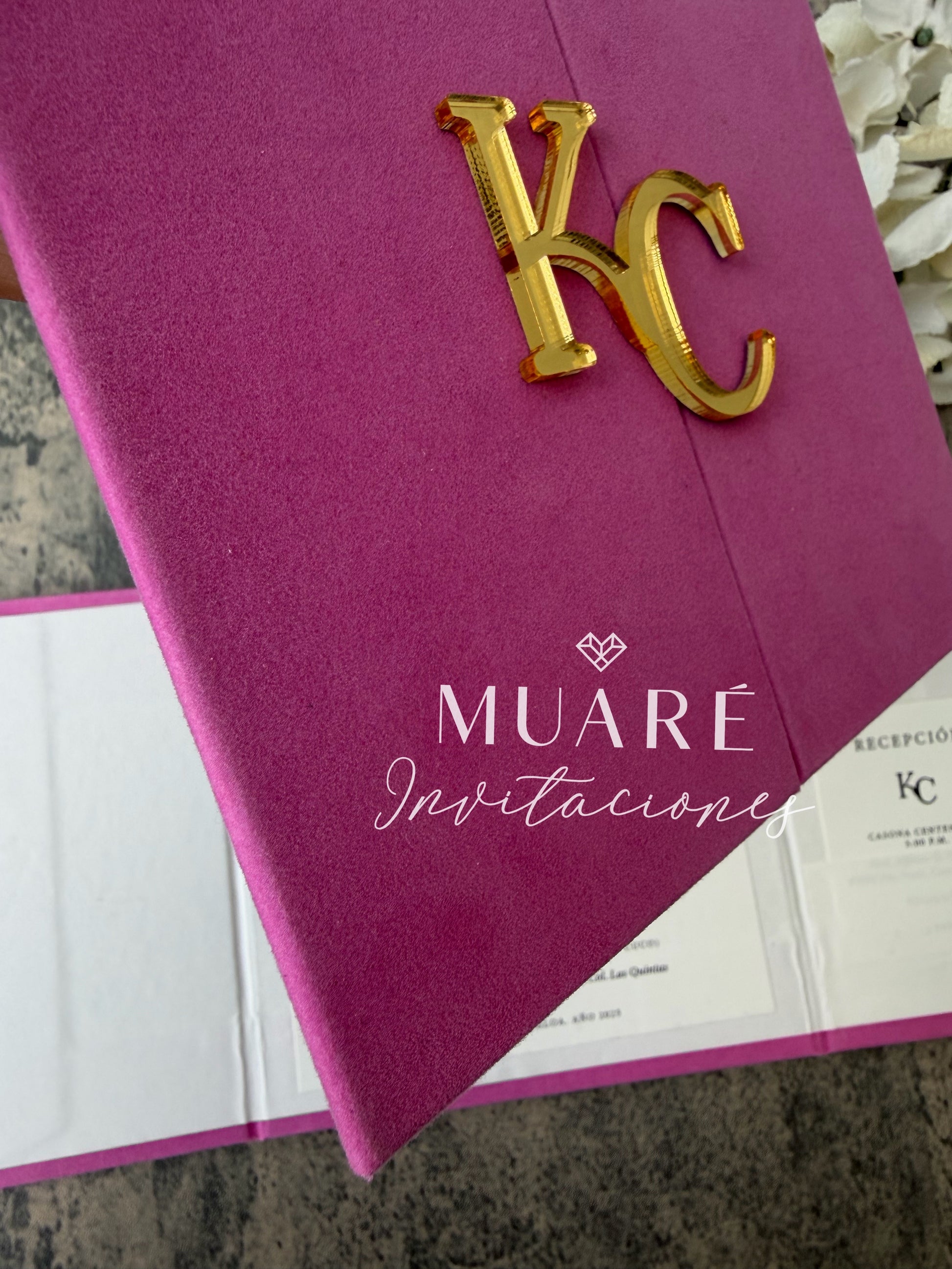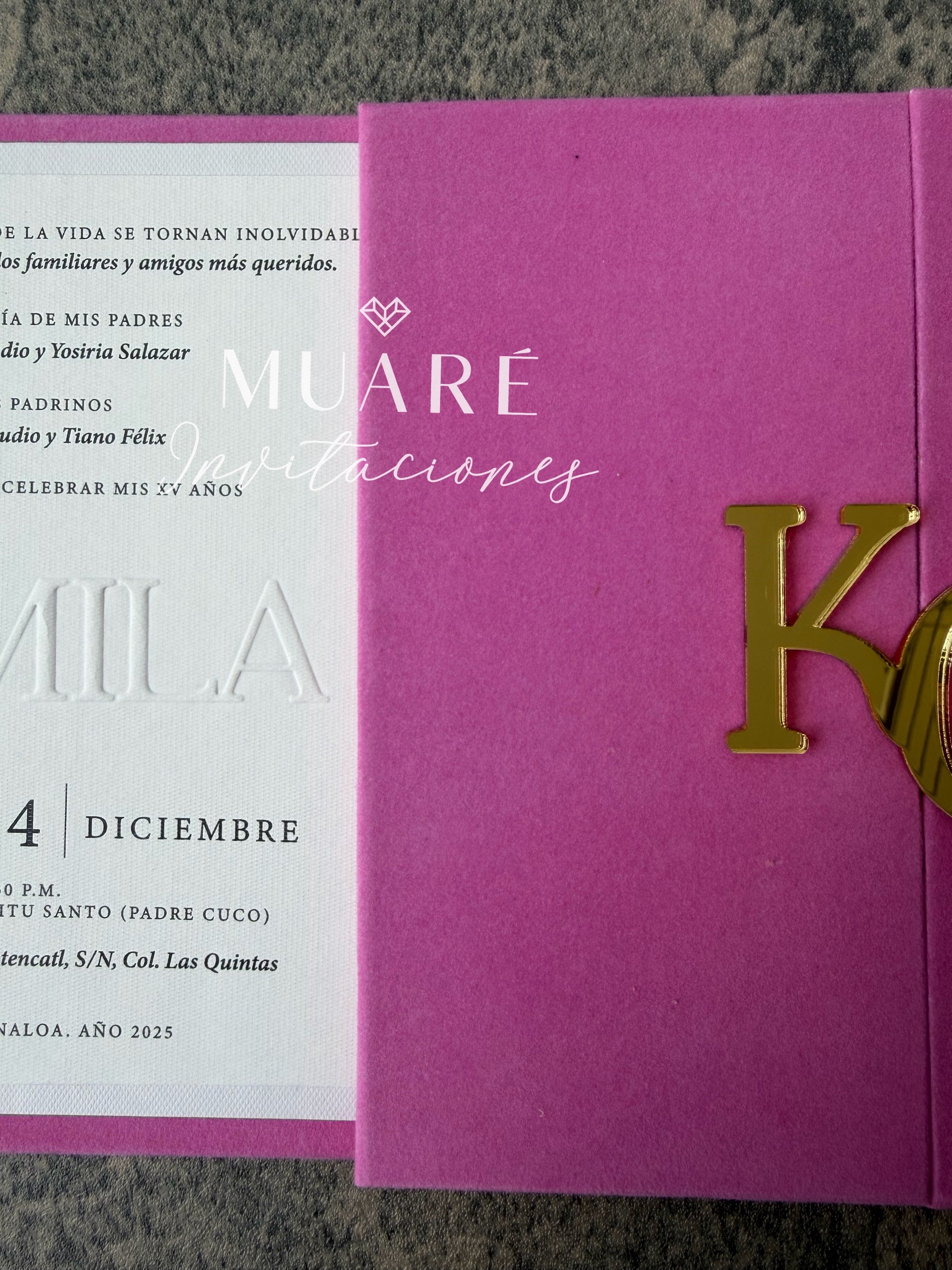 Invitación pasta dura cubierta en gamuza color rosa.